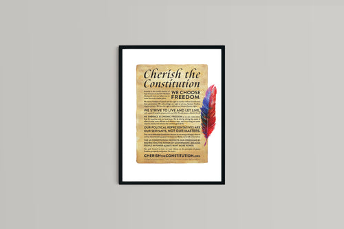 Proudly display the beautiful Cherish the Constitution poster in your home or office. This poster is not just a manifesto, it's a love letter to liberty. Be the example for others by proclaiming your love for our wonderful Constitution and our inherent, God-given rights. The Constitution is divinely inspired, but in order for it to protect us, we must protect it. We must cherish our Constitution. The poster is printed on high quality stock, and is 18" wide by 24" tall. It comes rolled up. Frame not included.